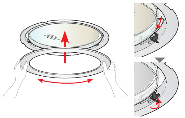 - Se la plafoniera presenta una cornice interna, è necessario rimuovere la cornice semplicemente facendola scattare, spostando le piccole clip in posizione di sblocco. In questo modo potrai estrarre il vetro del diffusore.